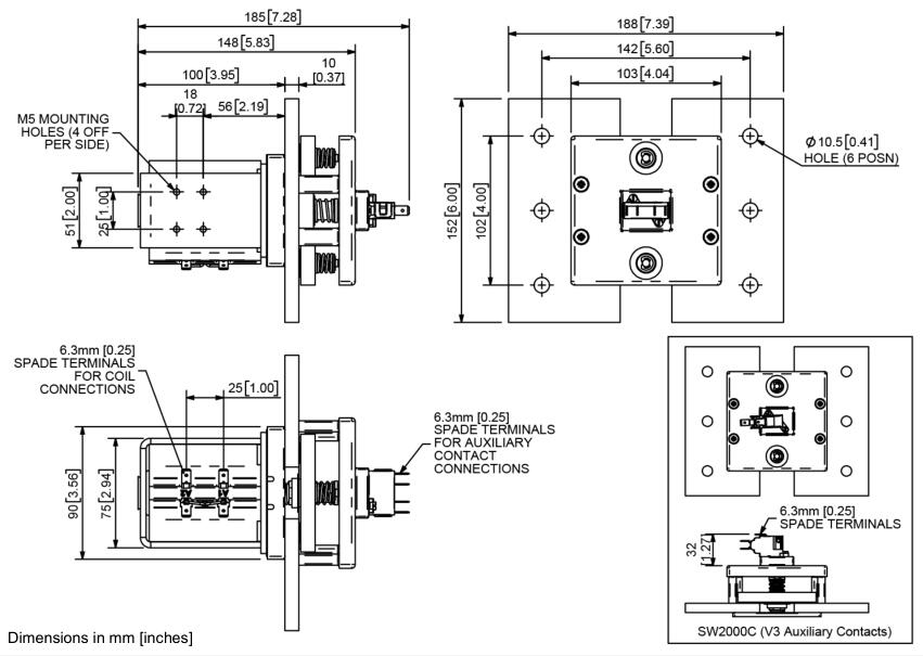 SW2000具有双重断裂的主触点,具有耐焊接,耐磨损和导电性能优异的银合金尖端。主触点上的银镀层是SW2000的标准配置,但是,也可以将其排除在规范之外。这种紧凑型接触器可以垂直或水平安装母线,但是如果垂直安装,线圈应位于底部。可选附件包括辅助开关,支架,线圈表面处理和磁性锁定 - 这可以使接触器保持闭合状态,同时不消耗线圈功率。